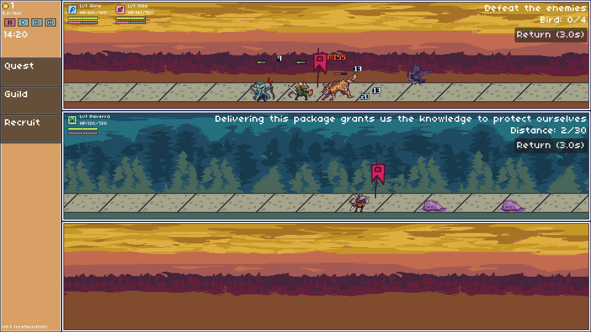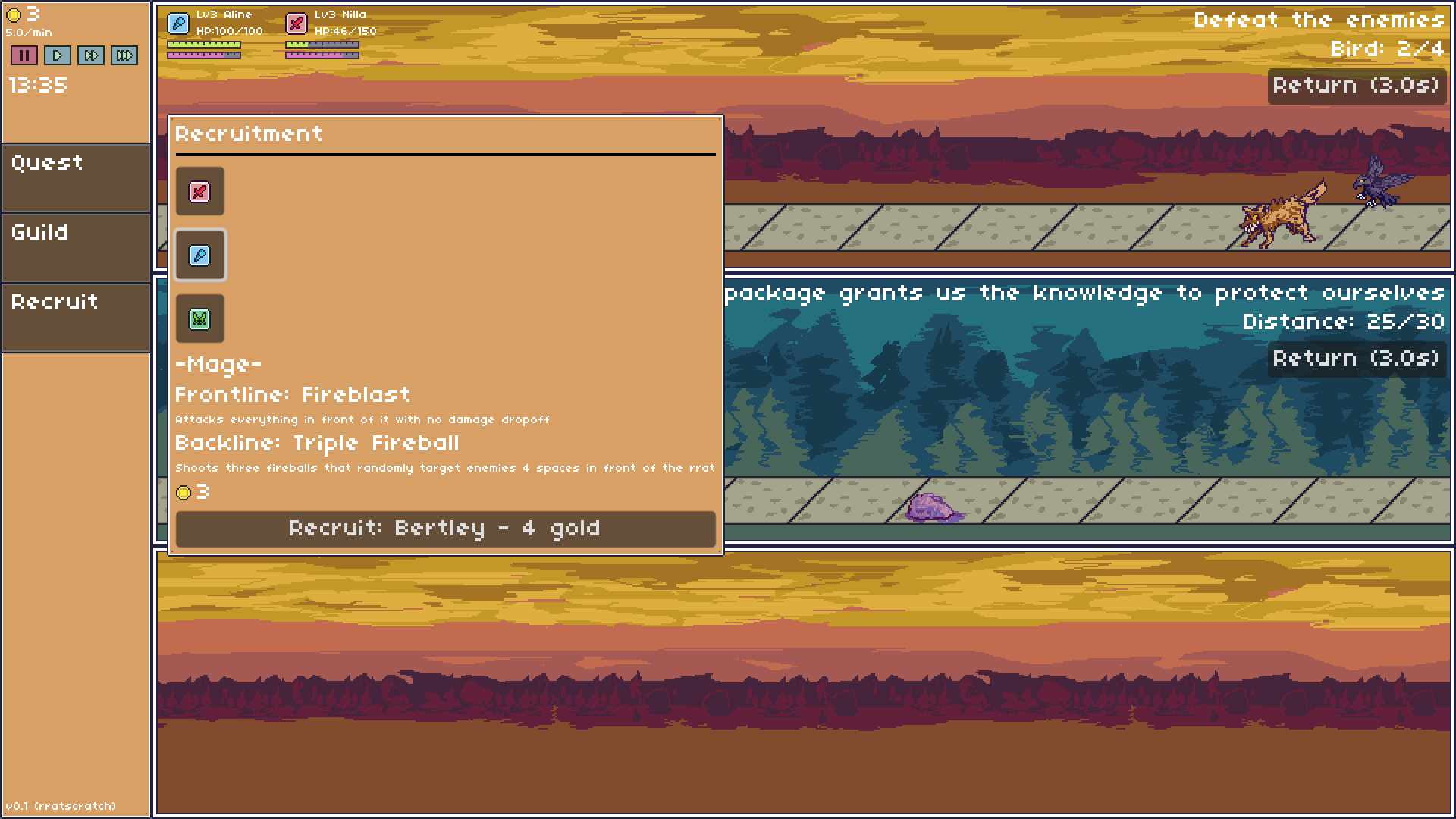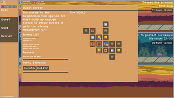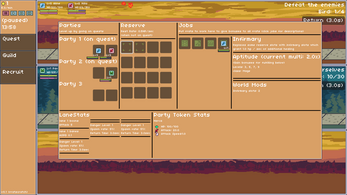 Guildrrats: Trilane is an adventure simulation game where you build up a guild of rrats to defeat the MEGADEMON within 15 in-game minutes. The portal to the MEGADEMON is unlocked after completing your first quest. To start your first quest, recruit a rrat or two from the recruit tab on the left and assign them to a party in the guild tab. Then on the Quest tab, click the orange cell in the middle of the map, pick your party, and then run the quest.